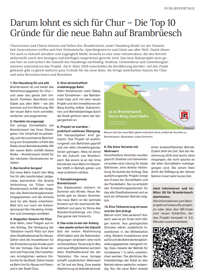 sicherstellt sowie den heutigen und künftigen Ansprüchen gerecht wird. Das neue Bahnprojekt setzt genau hier an und sichert die Zukunft des Hausbergs nachhaltig. Stadtrat, Gemeinderat und Umweltorganisationen unterstützen das Projekt. Am 8. März 2026 entscheidet die Bevölkerung darüber. Auf den Punkt